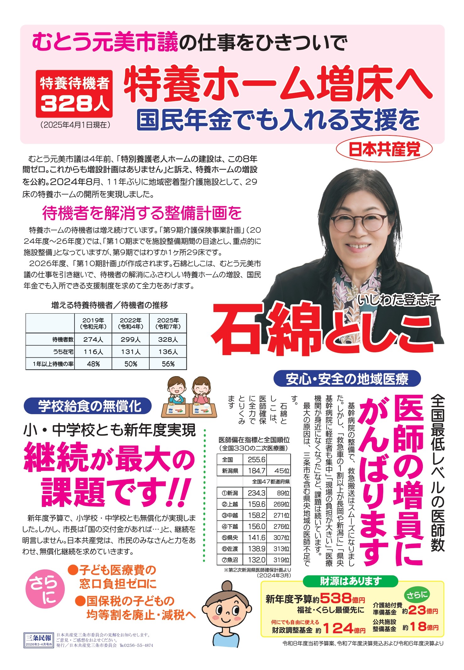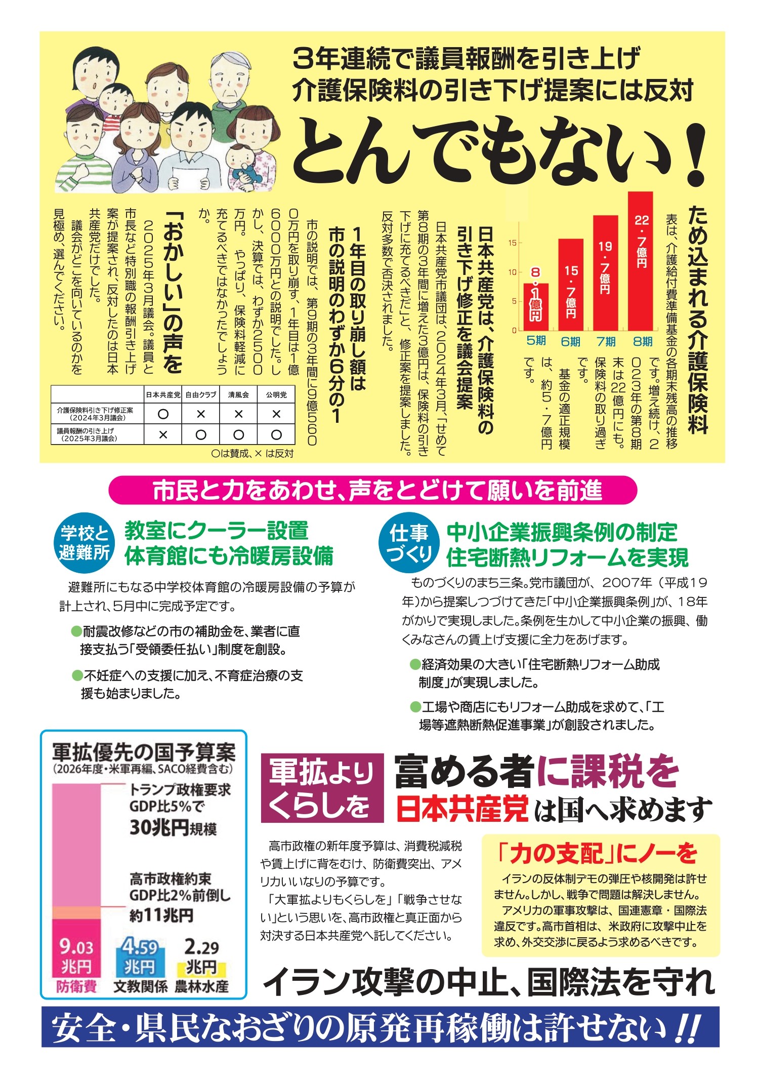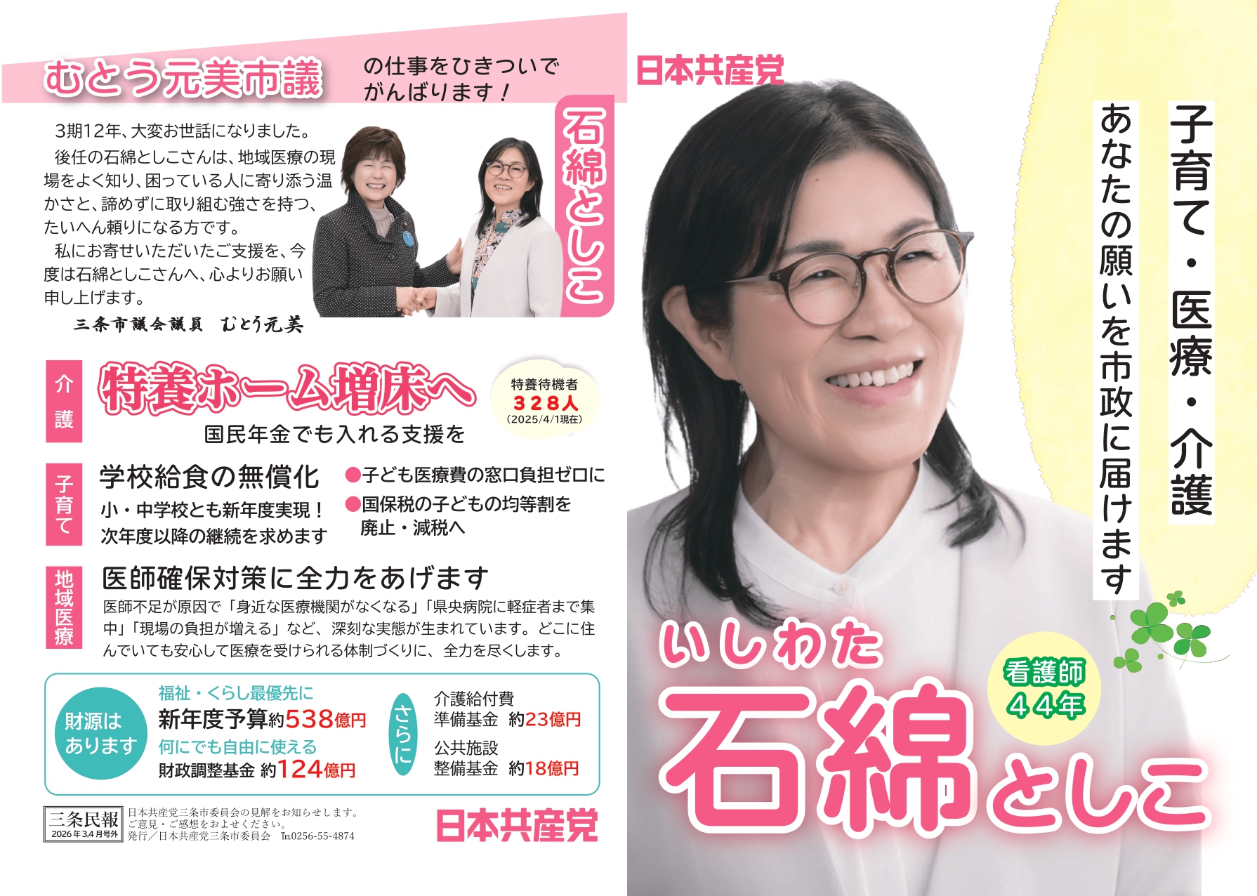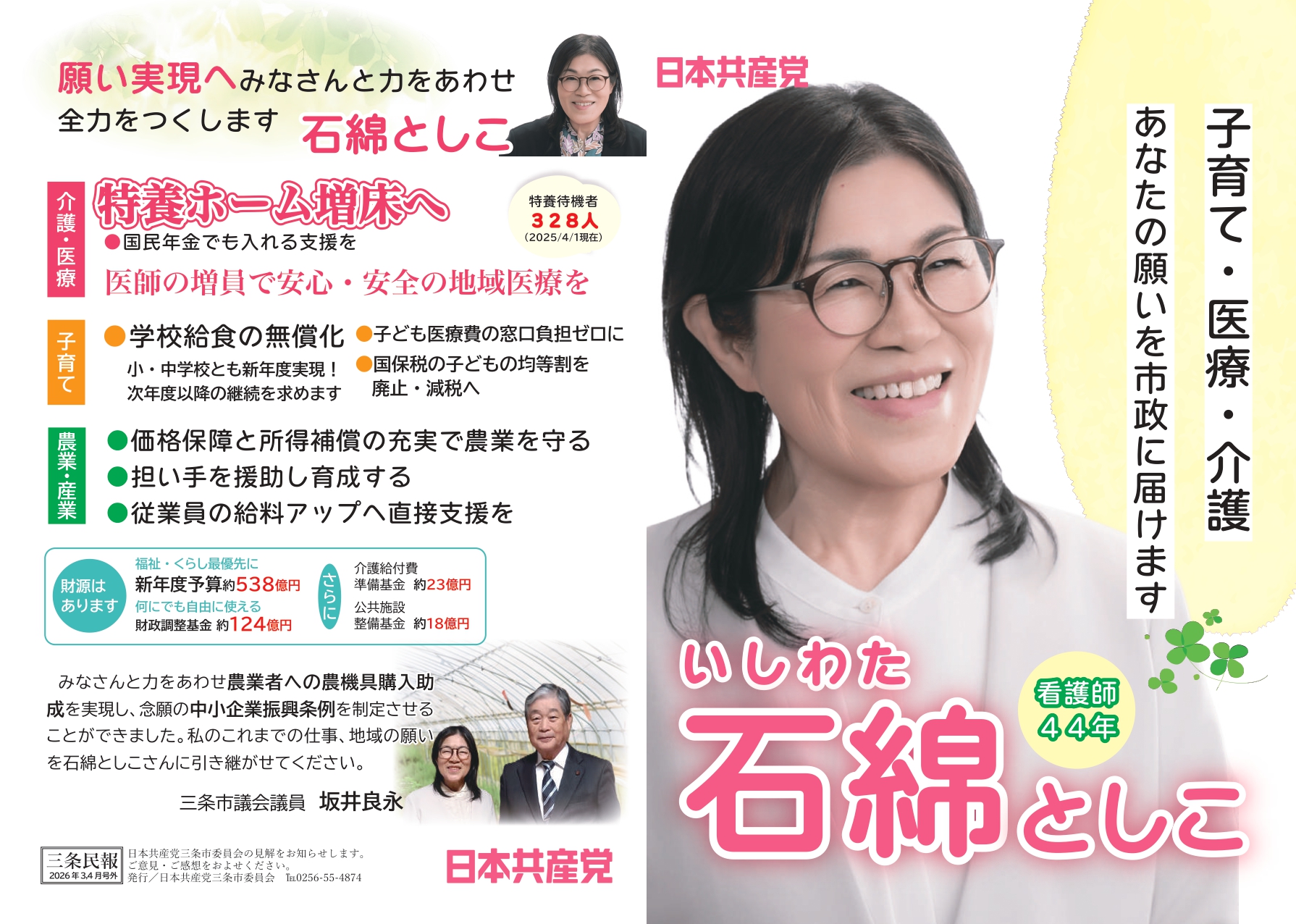 三条民報2026年3・4月号外 (左から)4・1面、2・3面