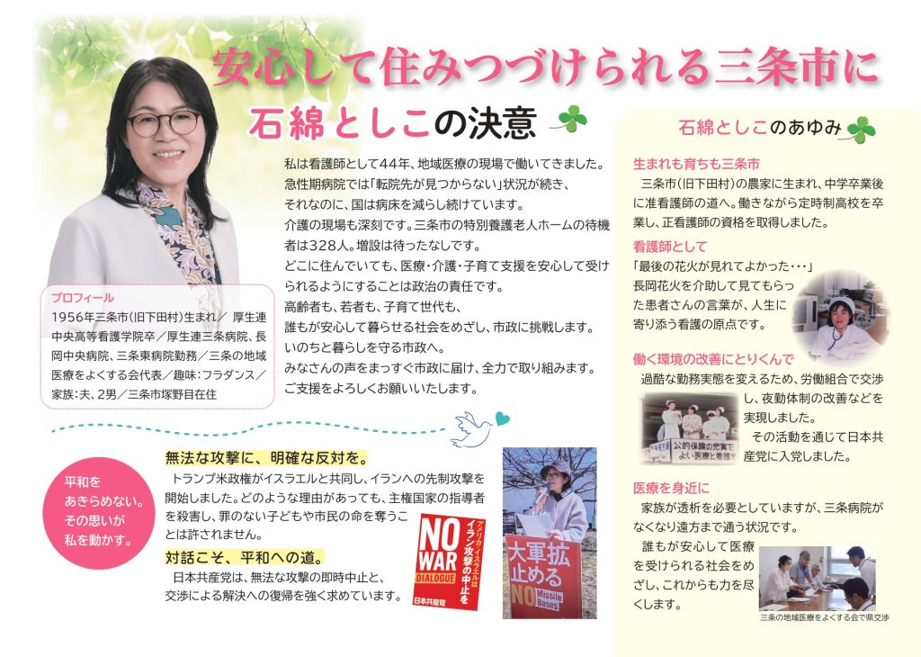 三条民報 2026年3、4月号外 左から4・1面、2・3面