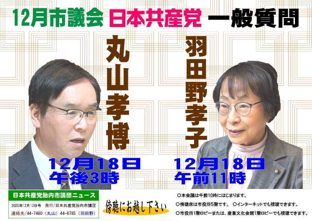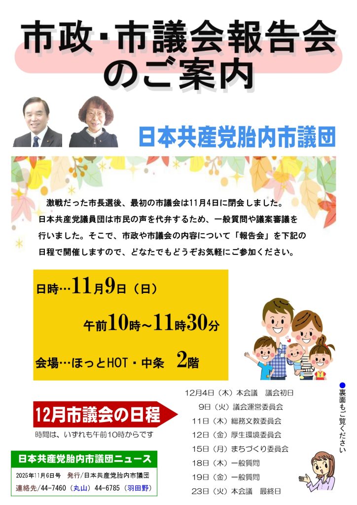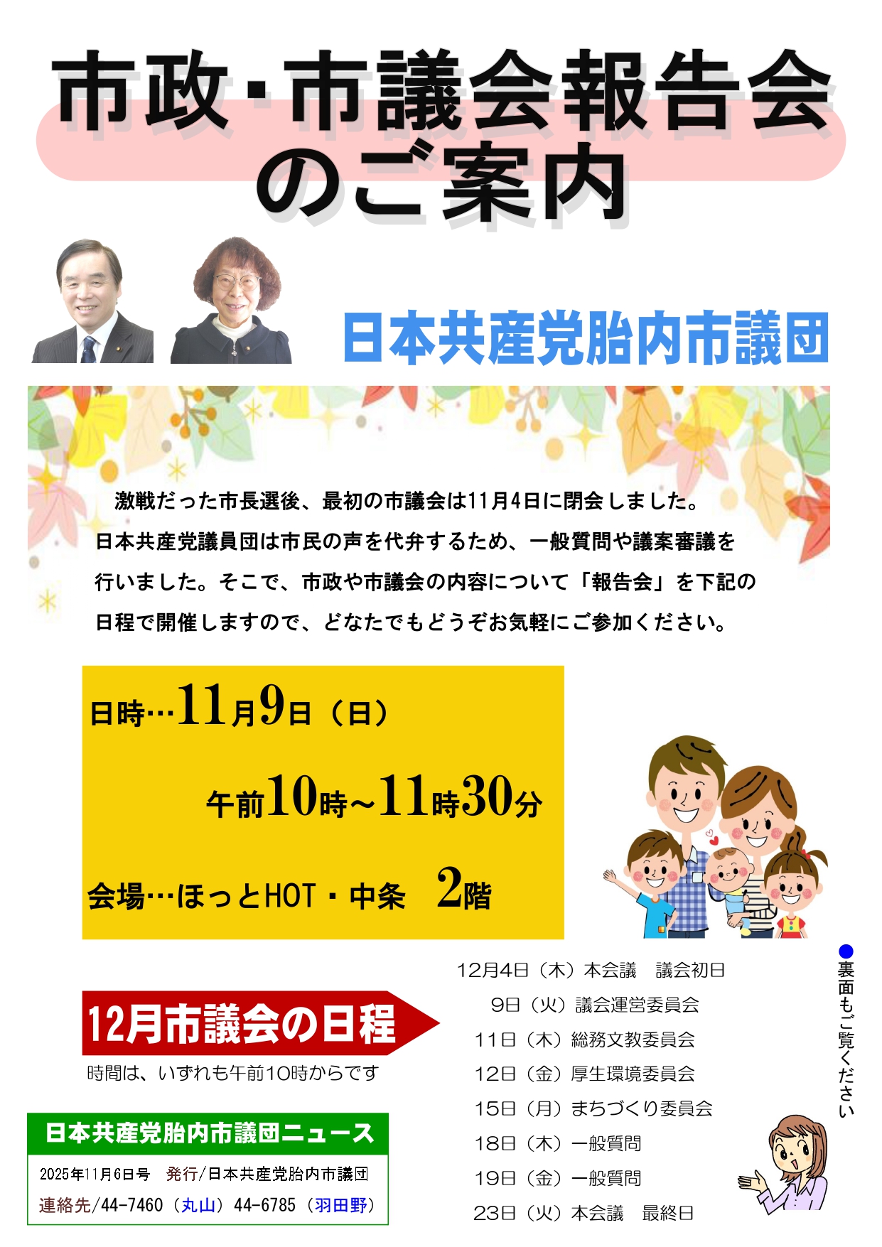 胎内市議会議員団(丸山孝博、羽田野孝子)の議会報告です。