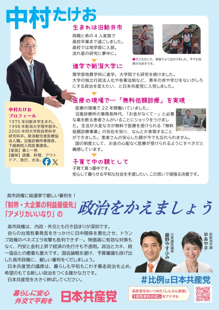 新潟大学法学部卒。舟江病院、下越病院に勤務。新潟市議2期6年。現在党県委員。新潟市西区在住。