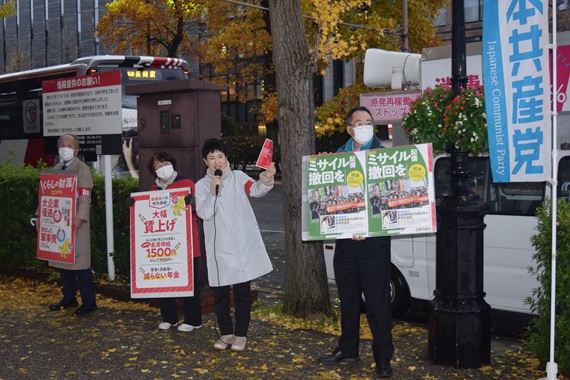 日本共産党北陸信越ブロックいっせい宣伝で21日、新潟駅前で党新潟県委員会と新潟地区委員会が宣伝し、「東京電力柏崎刈羽原発の再稼働を県知事、県議会だけで決めるな」「高市首相の台湾有事発言の撤回を」などと訴えました。新しい入党よびかけリーフも読み上げて紹介し、「共産党がんばれ」などの激励やリーフ受け取りがありました。