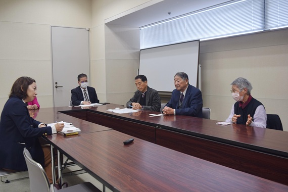 (右から)菅原、皆川、福地の各氏ら被害者から話を聞く吉良氏(左)=22日、長岡市