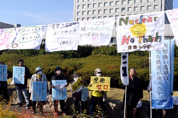 新潟県議会の12月定例会が2日開会されました。花角英世知事が東京電力柏崎刈羽原発の再稼働容認を改めて表明し、その判断について県議会に信任を問う考えを説明しました。県議会前では、県民約60人が「県議会だけで決めるな」「知事は『県民の信を問う』公約を守れ」と抗議宣伝しました。