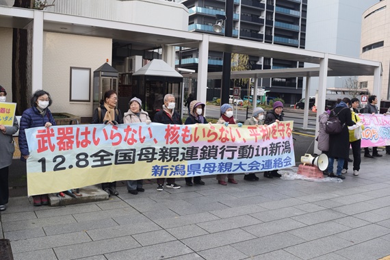 新潟県母親大会連絡会は、新潟市で8日、平和を守る母親全国連鎖行動の宣伝を行いました。約30人が参加して、召集令状(赤紙)の複製ビラを配布しながら、シールアンケート対話にも取り組みました。多くの若者が「戦争にならないために必要なこと」は、「国どうしで対話」と答えました。