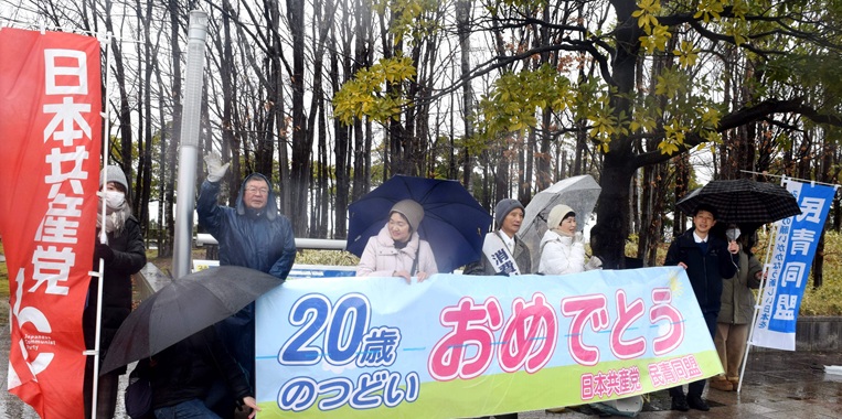 日本共産党新潟県委員会と日本民主青年同盟(民青)新潟県委員会は11日、新潟市の「二十歳のつどい」会場近くで宣伝しました。悪天候でしたが「二十歳おめでとうございます。希望ある社会を一緒につくりましょう」の訴えに笑顔で応じる若者もいました。