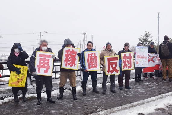 原発前では柏崎市・刈羽村の住民約30人が暴風雪の中、スタンディング宣伝しました。宣伝を呼びかけた柏崎市の吉田隆介さん(76)は、「知事が『県民の信を問う』と公約してきたのに、県民の意見を反映せず再稼働を決めたことは許されない」と批判。「原発を制御する命の制御棒でトラブルが続発し、東電に運転する技術はないことは明らかだ」と指摘しました。