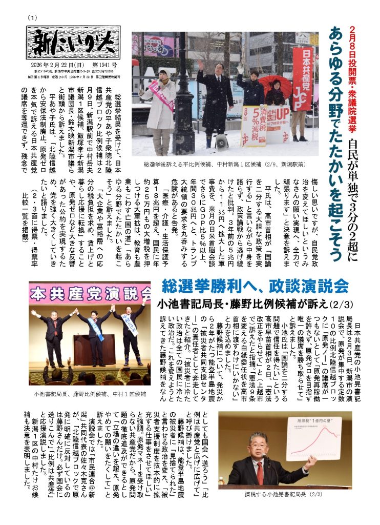 あらゆる分野でたたかいを起こそう 2026年2月21日 最終更新日時 : 2026年2月14日 JCP新潟 「新にいがた」2026年2月号 第1941号 1面のみ掲載します。購読のお申し込みは日本共産党新潟県委員会(電話025-247-6366)まで。 「新にいがた」月一回発行。A4・4㌻。購読料はひと月150円。 関連