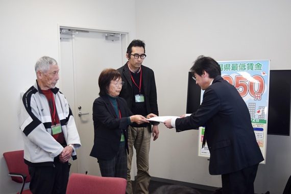 新潟県の三つの労働組合が26日、新潟労働局と新潟地方最低賃金審査会に対して、▽最賃を時給1500円以上に再改定▽中小企業への直接支援を県へ要請する―などの要請書を提出しました。要請したのは、新潟県労働組合総連合(県労連)、レインボーユニオン、えちごユニオンです。