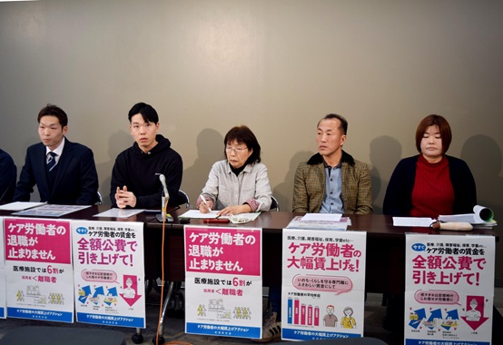 新潟県労働組合総連合は2月27日、新潟県庁で「ケア労働者大幅賃上げアクション」の記者会見を開きました。介護現場で働く労働者が「低賃金、長時間労働、人手不足で職員は疲弊している」「処遇改善へ職員1人が利用者3人をケアする国の配置基準や介護報酬の抜本改善を」などと訴えました。